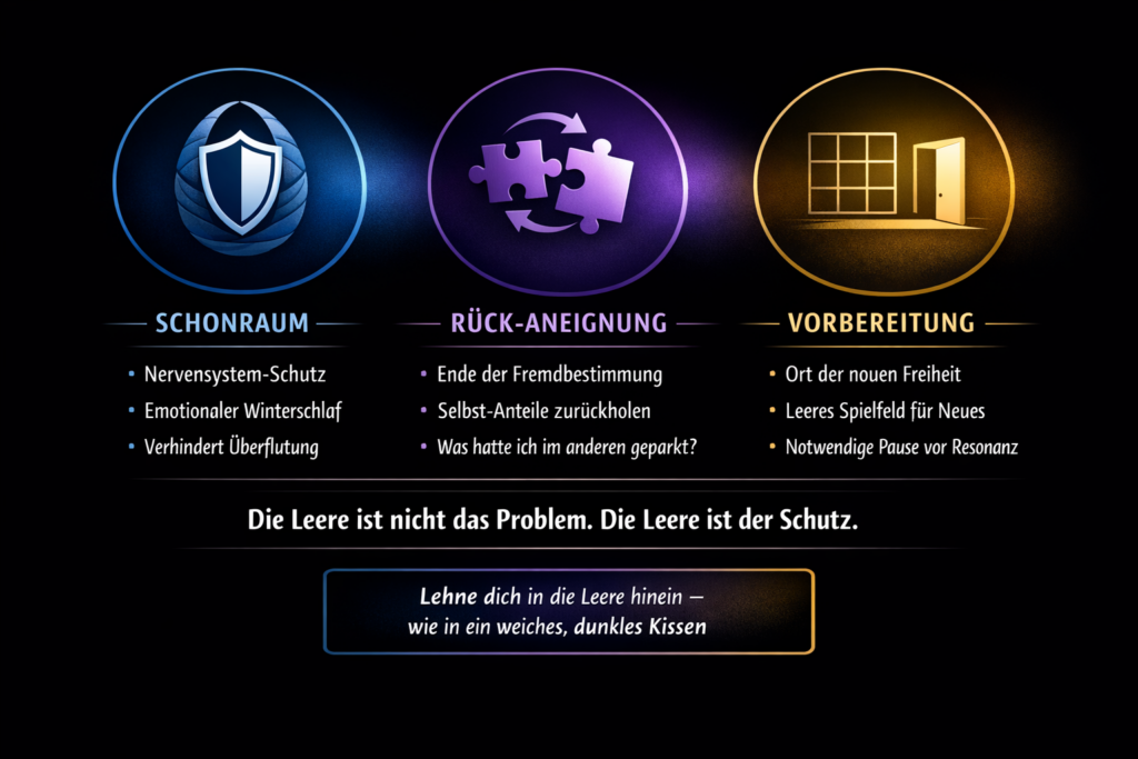 Stell dir vor, du könntest dich in diese Leere hineinlehnen, wie in ein weiches, dunkles Kissen. Sie muss nicht weg. Sie darf da sein. Sie ist der Ort, an dem dein System sich gerade ausruht.