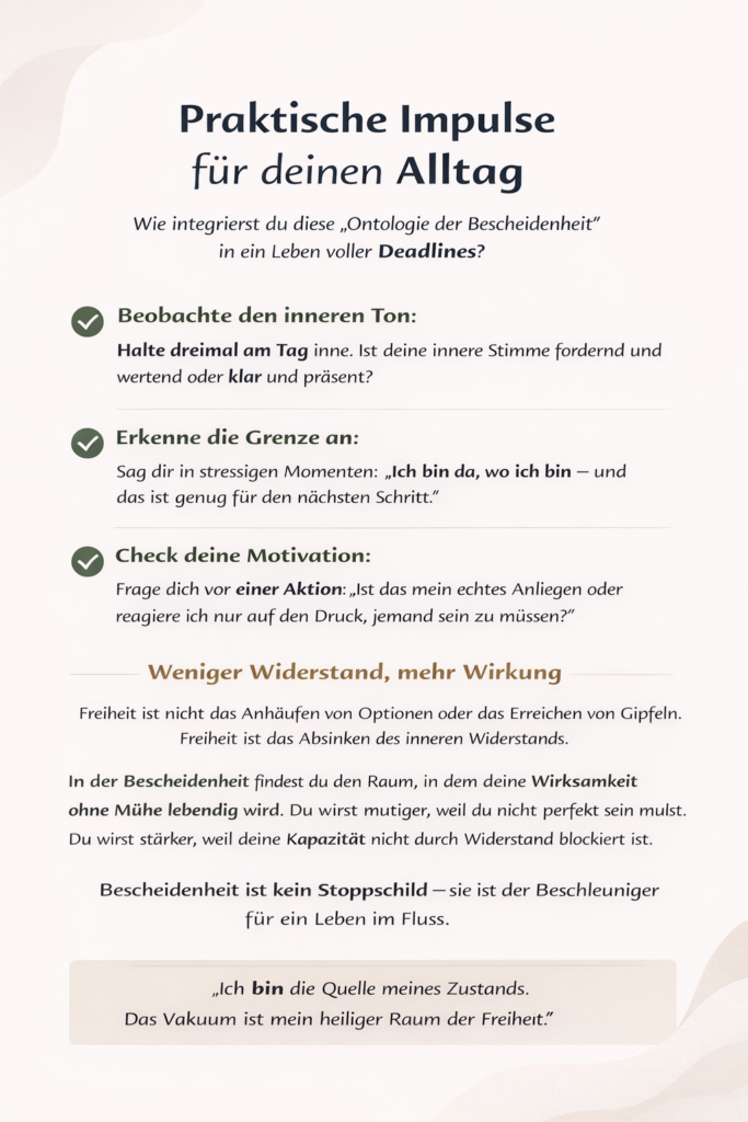 Doch was, wenn Bescheidenheit in Wahrheit der Schlüssel zu einer Freiheit ist, die wir mit Anstrengung niemals erreichen können? Im Kontext der Ontologie der mühelosen Wirksamkeit erweist sich Bescheidenheit nicht als Mangel, sondern als hochpräzises Werkzeug für echte Wirkkraft.