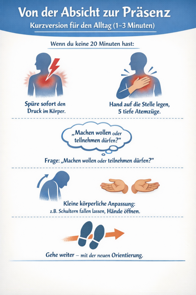 • Ist das, was ich gerade fühle, eher „Ich will etwas machen / erzwingen“ oder ein leises „Ich darf hier sein und teilnehmen“?