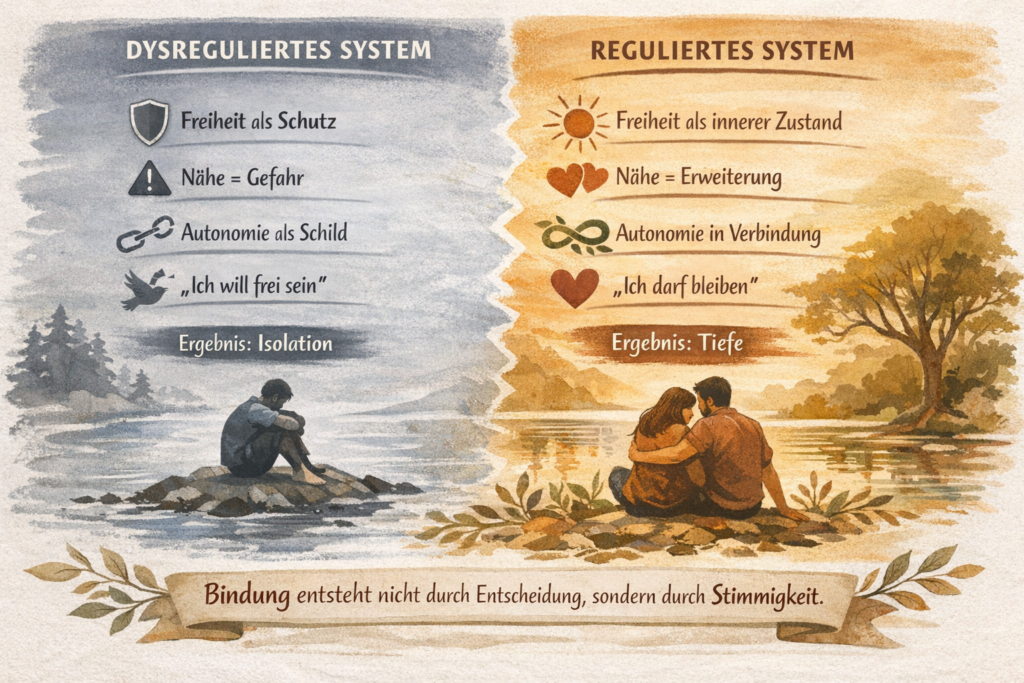 Und vielleicht ist die wichtigste Erkenntnis diese: Tiefe Bindung und echte Freiheit schließen sich nicht aus. Im Gegenteil, sie bedingen einander. Nur wer wirklich frei ist, kann sich wirklich binden. Und nur in echter Bindung entfaltet sich die volle Dimension menschlicher Freiheit – die Freiheit zu lieben, zu wachsen, zu vertrauen und gesehen zu werden, wie wir wirklich sind.